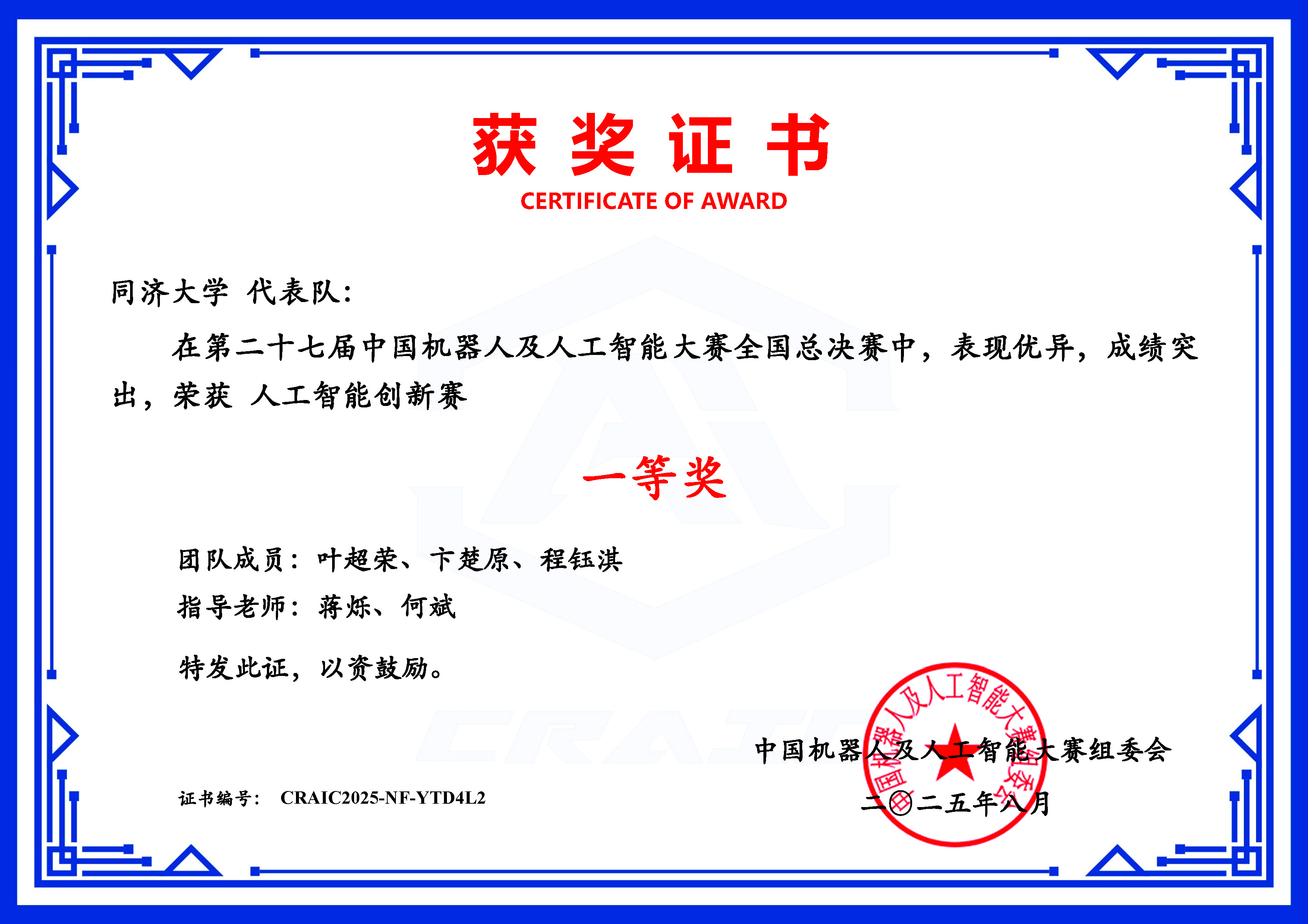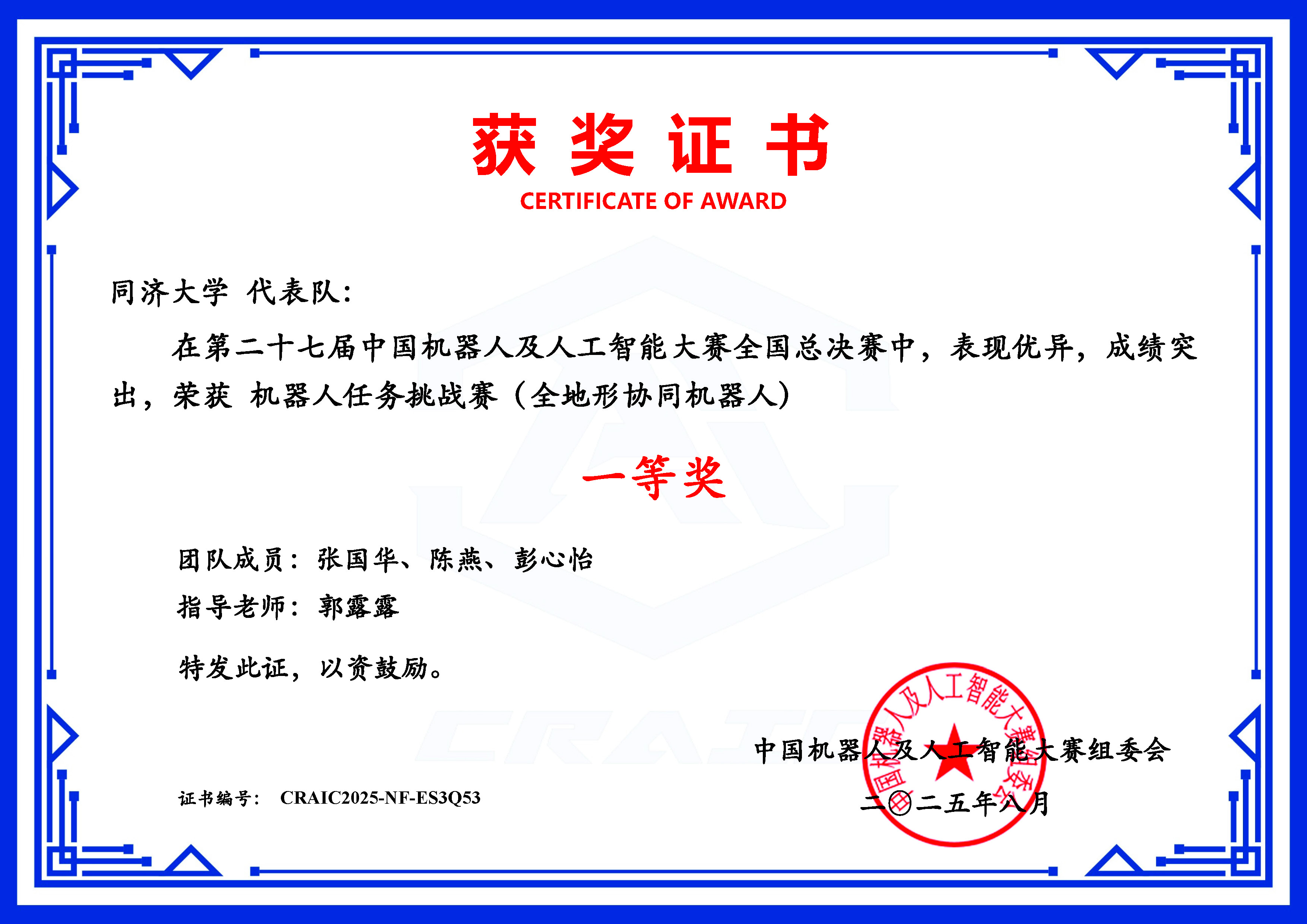 一等奖证书 队伍照片(从左至右:樊宇泽、冷柏瀚、邹雨霏)